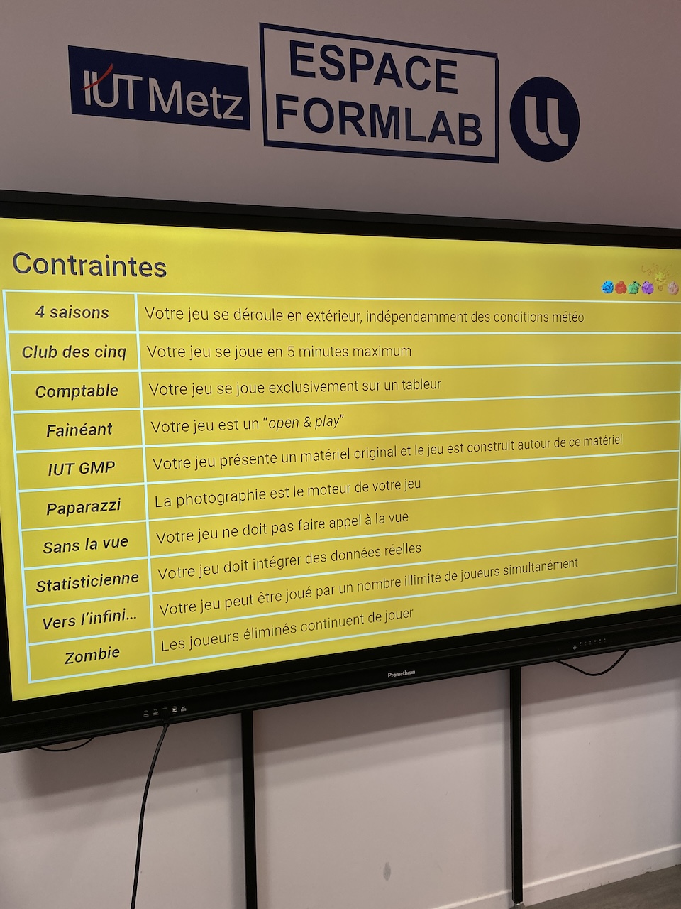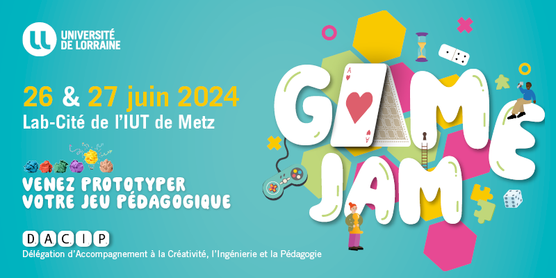 Les 26 et 27 juin 2024 au Lab-Cité, IUT de Metz. Pour cette 1re année, la Délégation d’Accompagnement à la Créativité, l’Ingénierie et la Pédagogie (DACIP) organise sa Game Jam et vous invite à prototyper votre futur jeu pédagogique au Lab-CITÉ de l’IUT de Metz. « A game jam is an accelerated opportunistic game creation event where a game is created in a relatively short timeframe » (Kultima, 2015).
