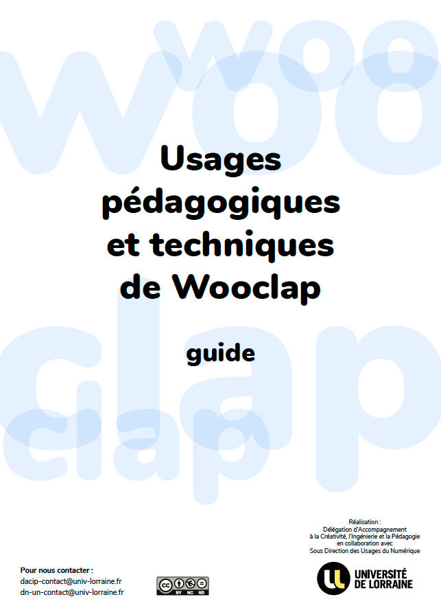 Guide Wooclap - Usages pédagogiques et techniques - Université de LorraineSouhaitant renforcer les possibilités d’hybridation, l’Université de Lorraine a lancé le projet FOrmation des Enseignants à l’Hybridation et au Numérique (FOEHN), dont l’un des axes consiste à favoriser l’interactivité en déployant l’outil interactif Wooclap.