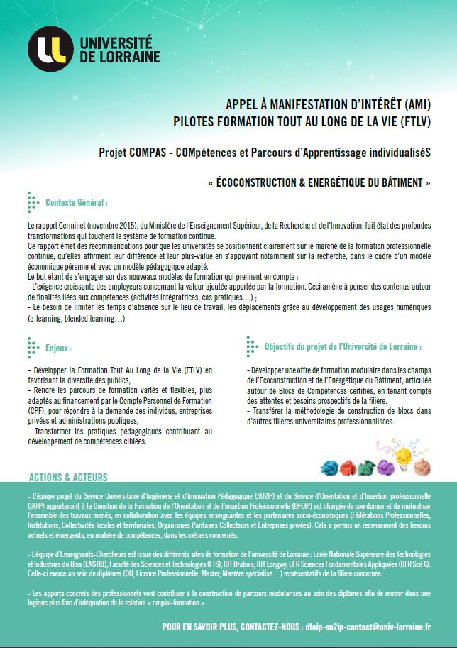 COMPAS : « COMpétences et Parcours d’Apprentissage individualiséS » consiste à bâtir une offre de formation modulaire, sous forme de blocs de compétences, dans le domaine de l’Energie/Ecoconstruction et combinant Formation Ouverte A Distance (FOAD), pédagogies actives et innovantes, Validation des Acquis de l’Expérience (VAE).