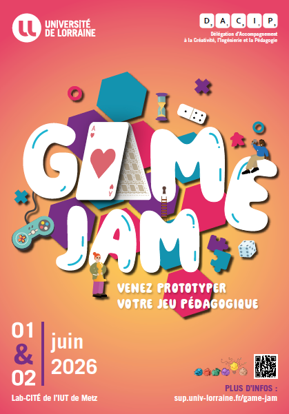 La Game Jam proposée par la DACIP est un temps dédié à la création de jeux de société à des fins pédagogiques. Elle se déroule sur deux jours au Lab-Cité sur le campus de l’Ile du Saulcy à Metz. Les enseignant·es et enseignant·es-chercheur·euses viennent avec une idée, une envie, un besoin de conception de jeux et ils ou elles seront accompagné·es par des professionnel·les et expert·es en ludification. Les enseignant·es et enseignant·es-chercheur·euses pourront également réaliser des prototypes de leur jeux (ou pièces de jeux) en s’appuyant sur les équipes du Lab-Cité.