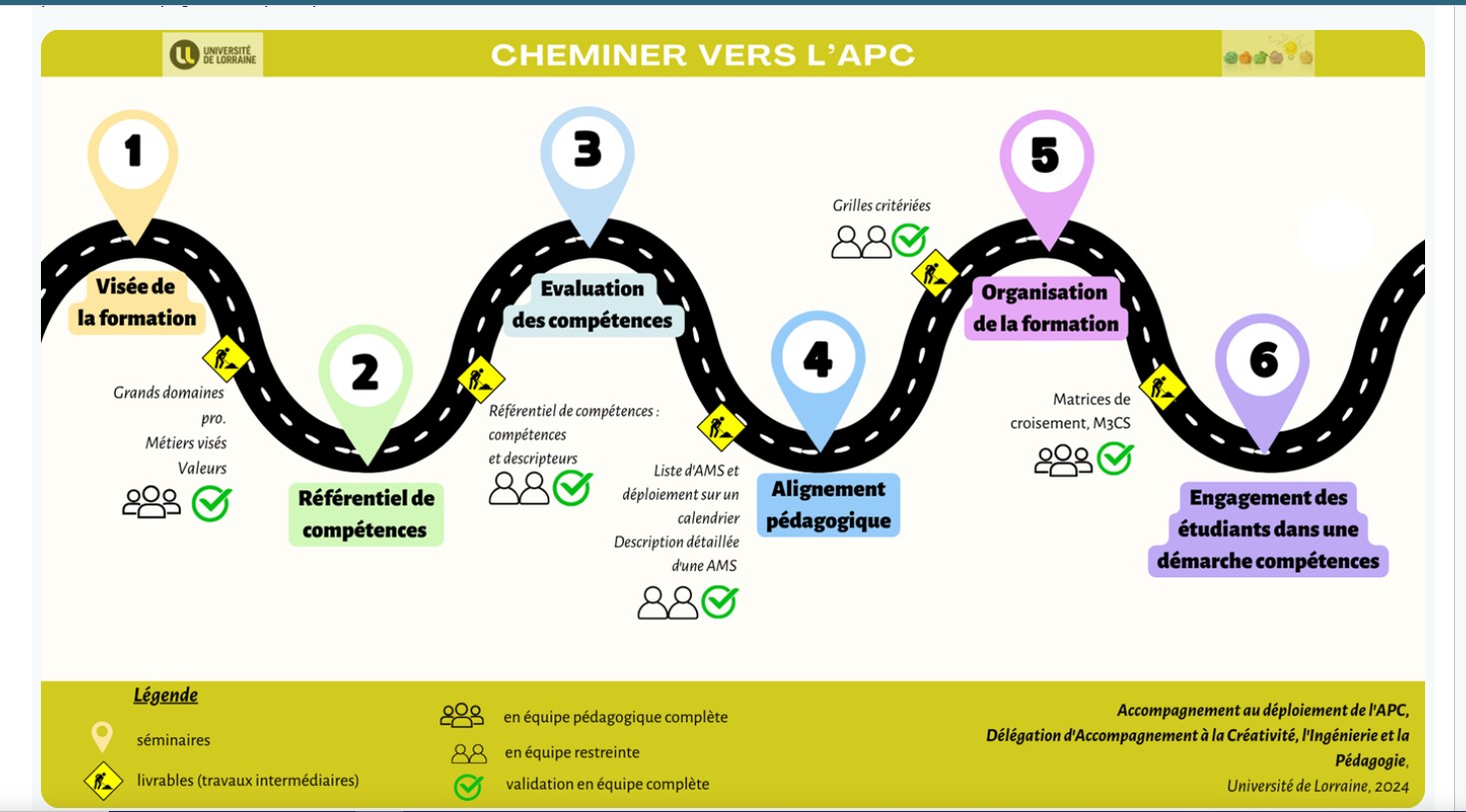 Dès 2014, l’Université de Lorraine s’est engagée dans le déploiement de l’Approche Par Compétences (APC) en incitant ses équipes de formation à prendre part à cette transformation pédagogique dans l’organisation de leurs formations.